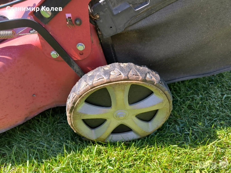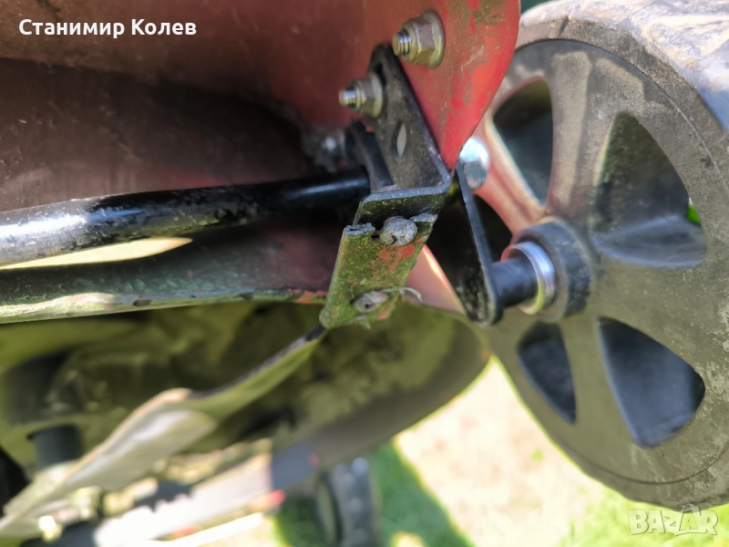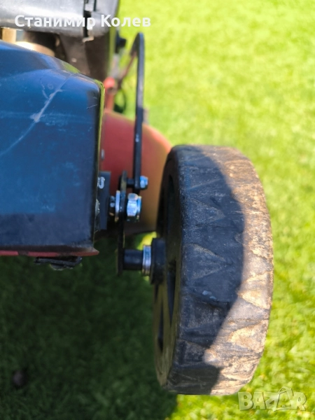 Гумената част на задните колела е закъсана и хваната с рапидки. Двигателя няма никакви проблеми. Има и резервен нов нож