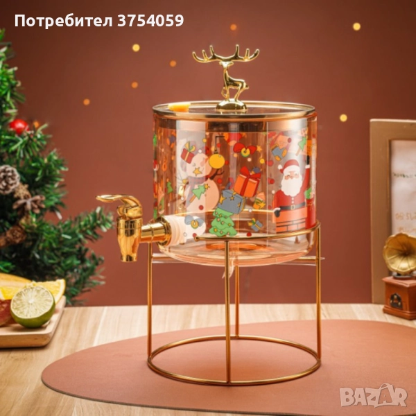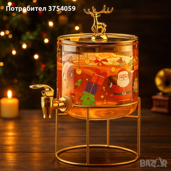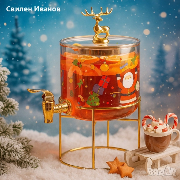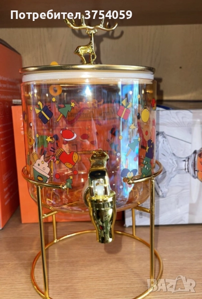 Стъклен диспенсър за напитки 2.6 L с коледен дизайн и златиста стойка → Обява 51818880