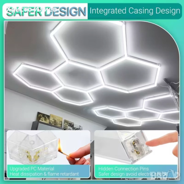 - Прахоустойчива и водоустойчива - Шестоъгълна LED светлинна лента със степен на защита IP54, подходяща за употреба във влажна среда. Може да се адаптира към различни сценарии на приложение и да се използва в тежки условия за дълго време. Оптично прозрачен PC капак за по-добро пропускане на светлина и по-добра водоустойчивост.