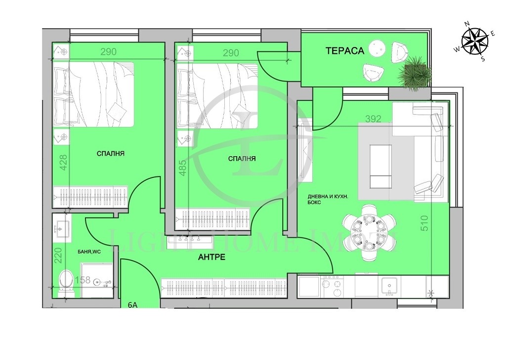 -Разпределение- Просторен хол с кухненски бокс, две непреходни спални, баня с тоалетна, входно антре и тераса.