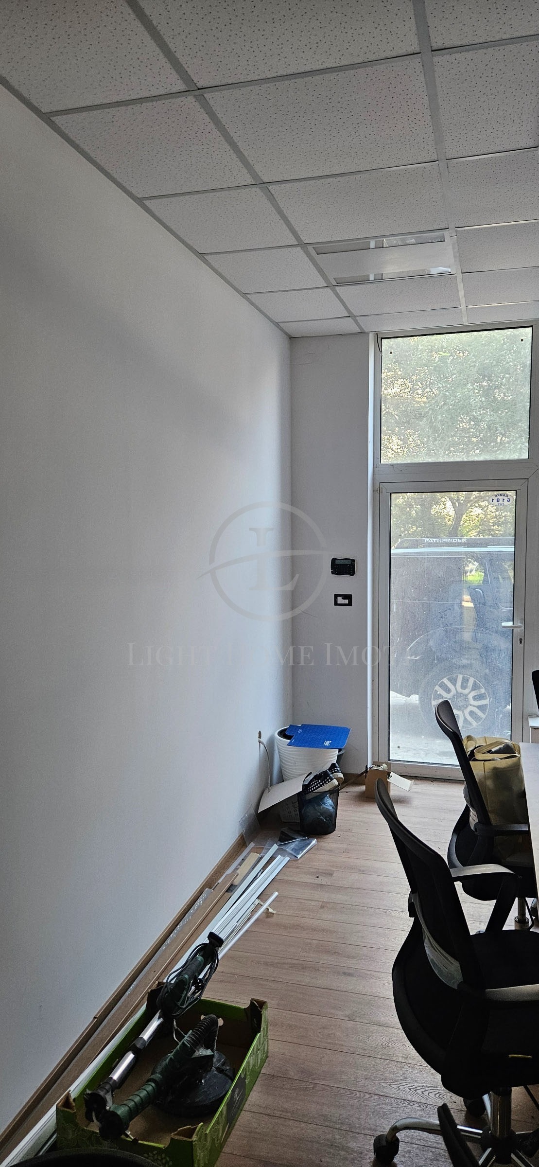 - Разпределение: четири помещения със стъклени витрини, сървърно помещение, два санитарни възела и кухненски бокс,