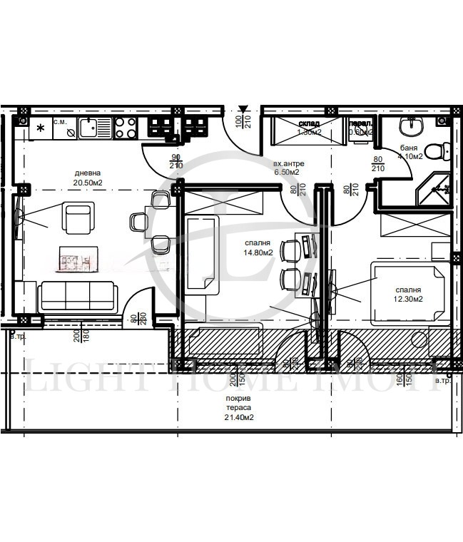 - Разпределение: Просторен хол с кухненски бокс , две непреходни спални, баня с тоалетна, тоалетна, входно антре и голяма тераса 21,40кв.м.