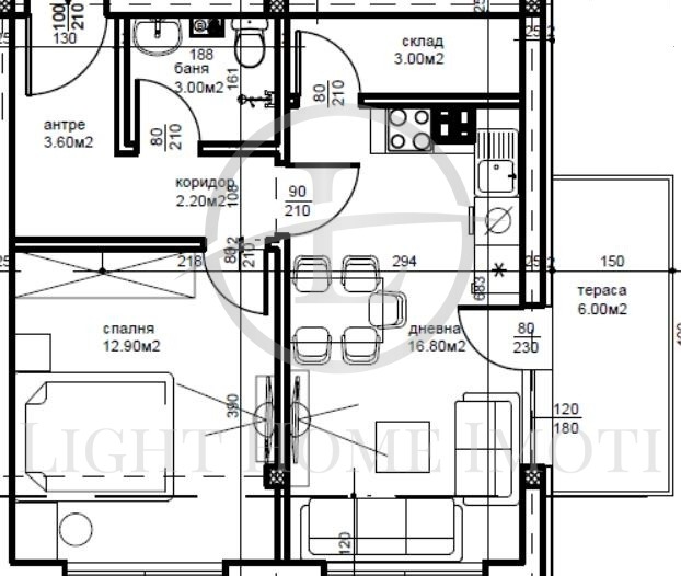 -Разпределение- хол с кухненски бокс, спалня, баня с тоалетна, склад, входно антре и тераса.