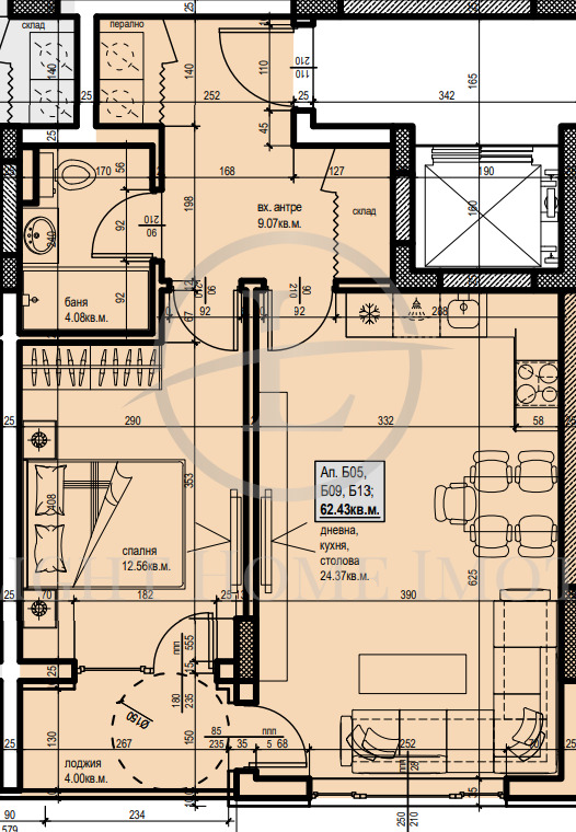 - Разпределение: Просторен и светъл хол с кухненски кът , голяма спалня, входно антре,баня с тоалента, килер и тераса.