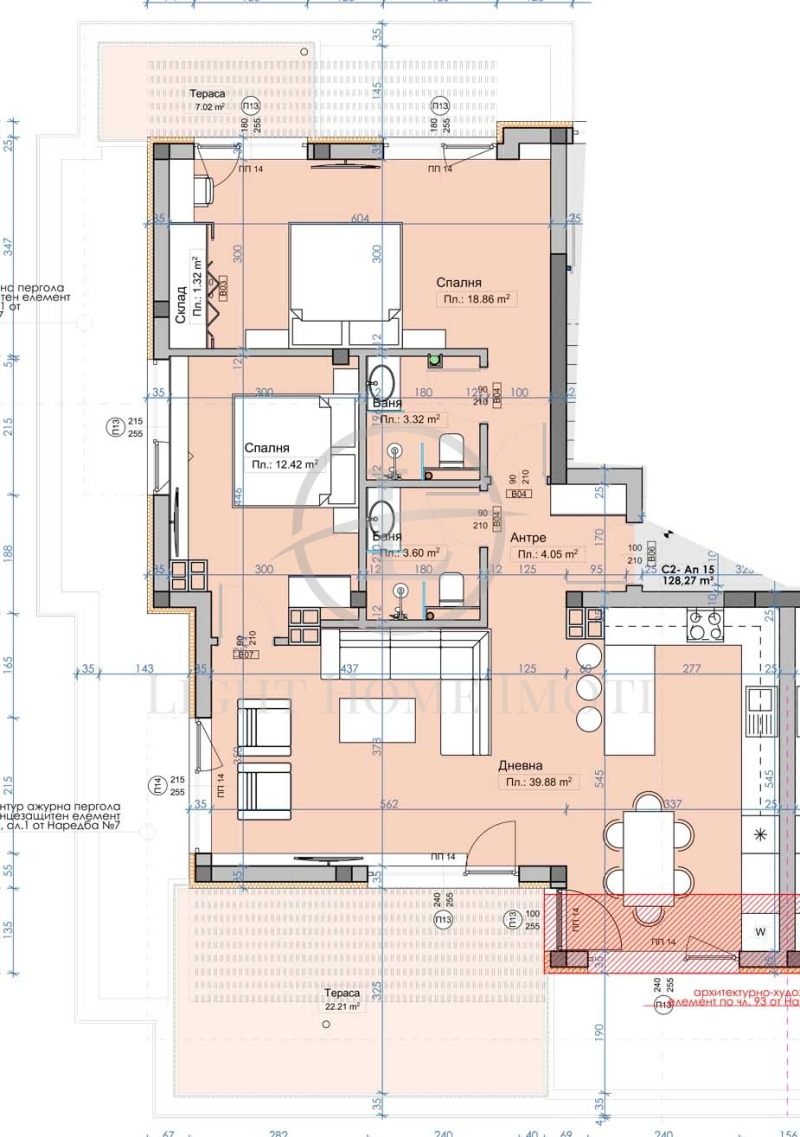 - Разпределение: Просторна и светла дневна с трапезария и кухненски бокс 40кв.м , две спалня, две бани с тоалетни, входно антре, склад и две панорамни тераси!