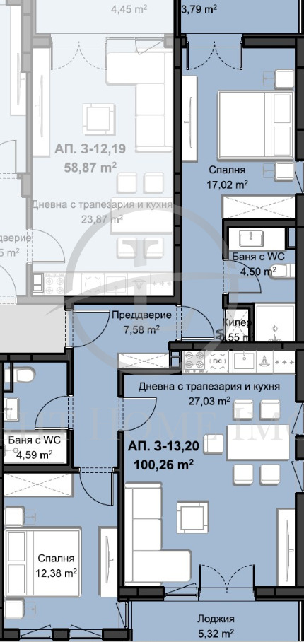- Разпределение: Просторен и светъл хол с кухненски кът , две големи спални, едната от които е със собствен санитарен възел, още една баня с тоалетня, входно антре, две тераси . Към апартамента има прилежащо избено помещение 3,35 кв.м.
