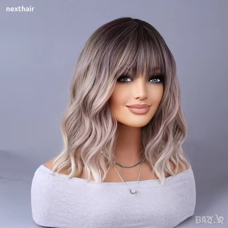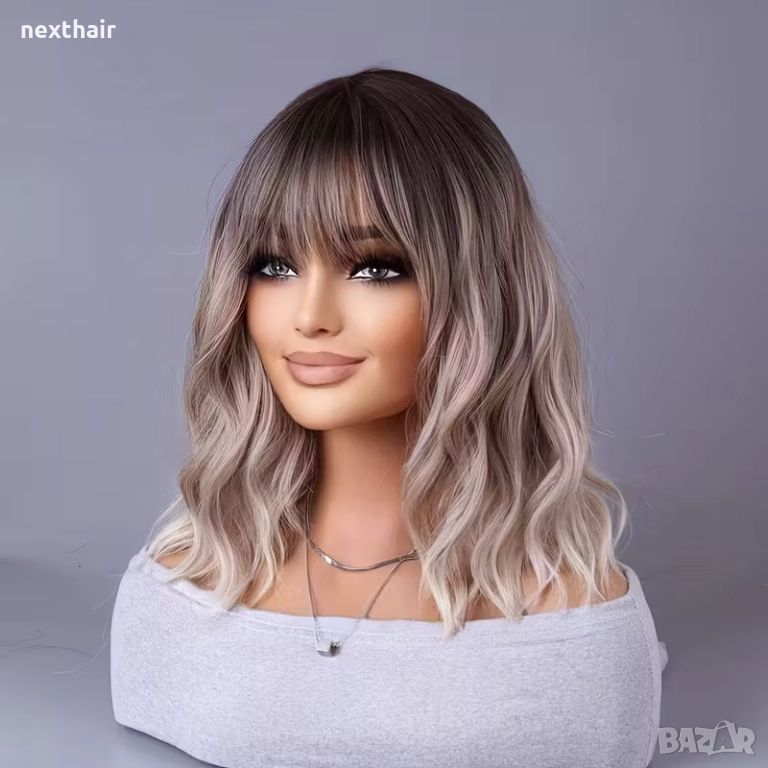 Подчертай своя стил с нашата елегантна синтетична перука с дължина 35-40 см, създадена в модерен тристепенен омбре ефект - от дълбоки тъмни корени, преминаващи в естествено русо и завършващи с нежно пепеляво руси краища. Меките вълни и практичният бретон придават свеж, женствен и изключително модерен вид. Висококачествените синтетични влакна изглеждат като естествена коса и запазват формата си без усилие. Идеална за ежедневие, фотосесии или специални събития - перфектният начин да преобразиш визията си мигновено.