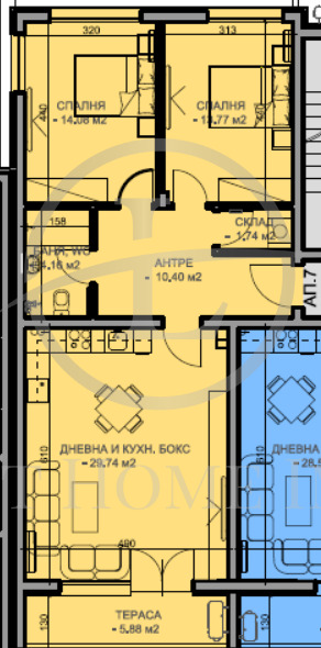 - Разпределение: Голям хол с кухненски бокс, две просторни спални, баня с тоалетна, отделно тоалетна ,входно антре , тераса и склад