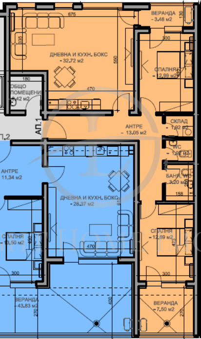 - Разпределение: Голям хол с кухненски бокс, две просторни спални, баня с тоалетна, отделно тоалетна ,входно антре , две тераси и склад