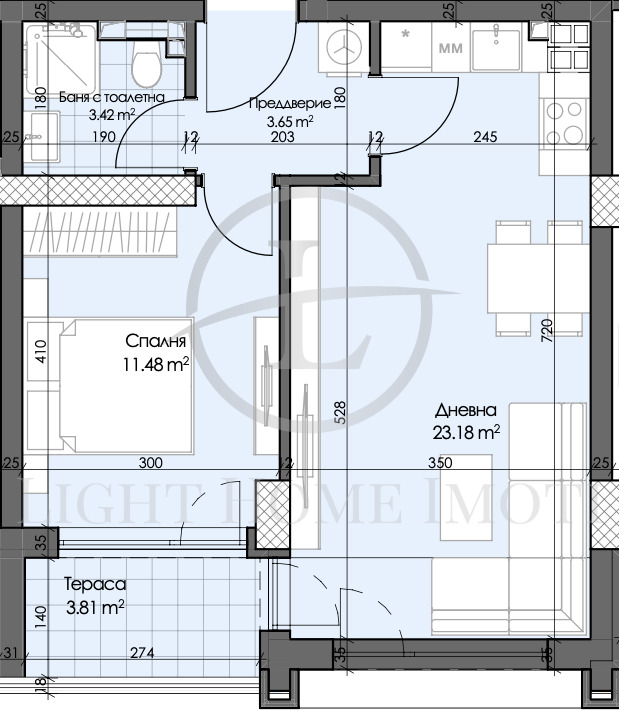 - Разпределение: Хол с кухненски бокс, спалня, баня с тоалетна, антре, тераса и склад