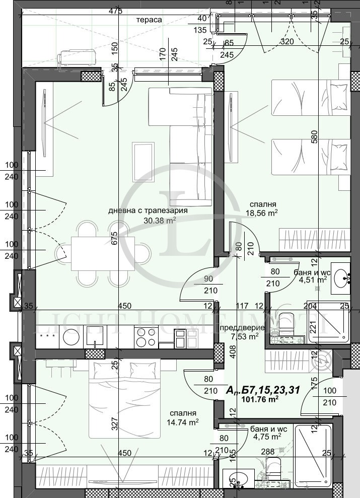 -Разпределение- Просторен хол с кухненски бокс, две големи спални, две бани с тоалетни, входно антре, тераса и прилежащо избено помещение.