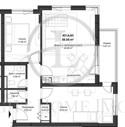- Разпределение: Просторна и светла дневна с кухненски бокс 27 кв.м , две големи спални, баня с тоалетна, отделно тоалетна, входно антре, килер и тераса!