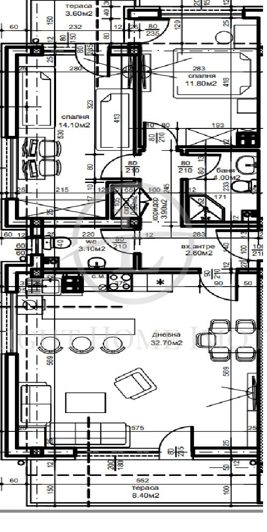-Разпределение- Просторен хол с кухненски бокс (33 кв.м.), две непреходни спални, баня с тоалетна, тоалетна, килер, входно антре и две тераси.