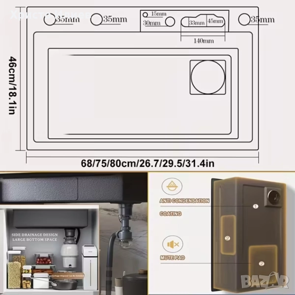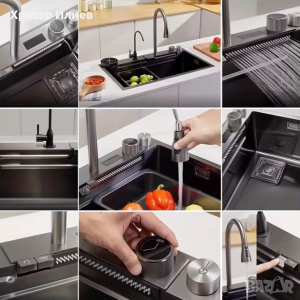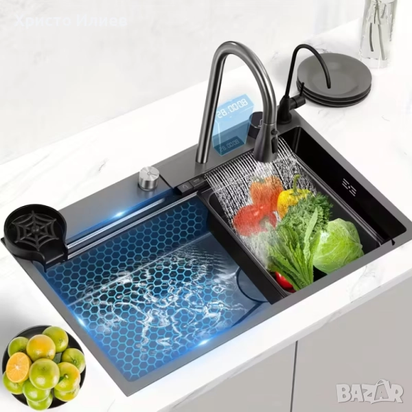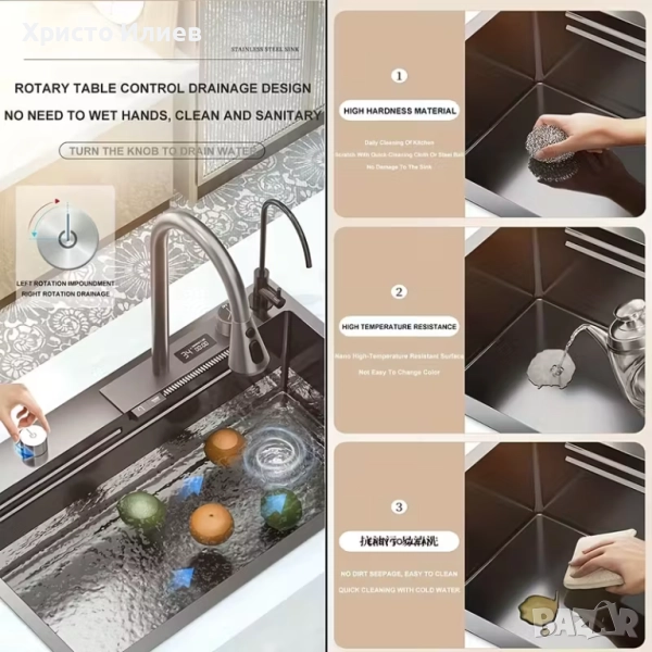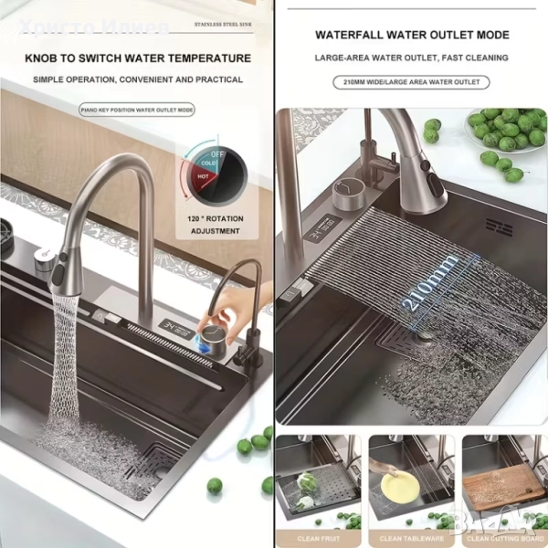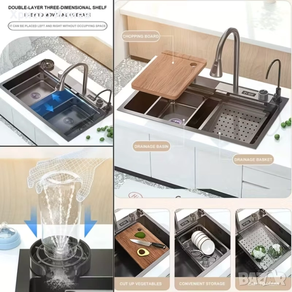 Висококачествена мултифункционална мивка от неръждаема стомана. Създава многофункционално работно пространство, за да можете удобно да миете плодове и зеленчуци с нейния