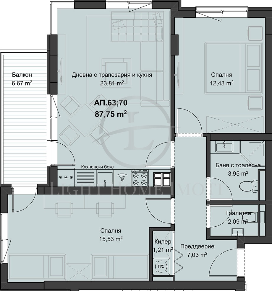 - Разпределение: Просторна и светла дневна с трапезария и кухненски бокс , две спални , баня с тоалетни, отделно тоалетна, входно антре, килер и тераса!