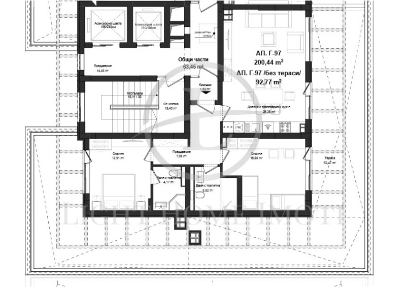 - Разпределение: Просторна и светла дневна с трапезария и кухненски бокс, две спални , две бани с тоалетни, входно антре и голяма панорамна тераса с невероятна гледка! Към апартамента има прилежащо избено помещение 4,64кв.м