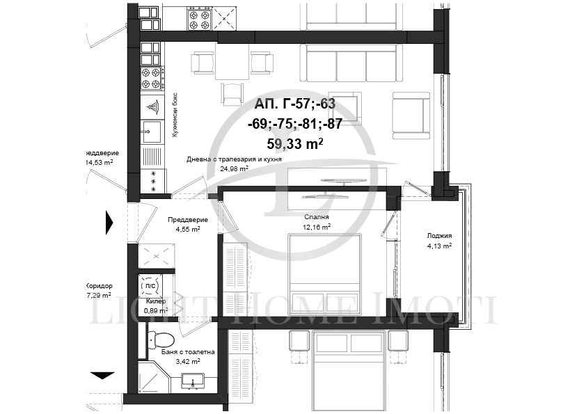 - Разпределение: Просторна и светла дневна с трапезария и кухненски бокс, спалня , баня с тоалетни, входно антре, килер и тераса! Към апартамента има прилежащо избено помещение 2,38кв.м