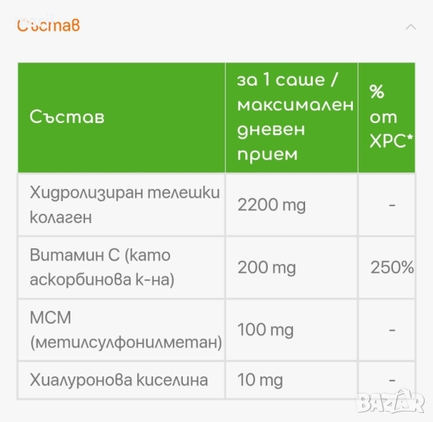 ПРЕДНАЗНАЧЕНИЕ: Подхранва костите и ставите в дълбочина; Подкрепя здравината и еластичността на ставния хрущял; Оказва благоприятно действие върху ставите; Повлиява положително ставния комфорт. ДЕЙСТВИЕ НА СЪСТАВКИТЕ: Хидролизиран телешки колаген – основна протеинова молекула, която играе важна роля в структурата и функциите на човешкото тяло. Колагенът се намира в кожата, съединителната тъкан, сухожилията, костите и хрущялите и е отговорен за придаването на здравина и еластичност на тези телесни структури. Когато нещо не е наред с колагена, това нерядко води до различни здравословни състояния и заболявания, тъканите на тялото стават слаби и крехки, отслабват костите и ставите. С напредването на възрастта производствата на собствен колаген от човешкото тяло спада драстично, получава се дефицит и това е една от главните причини хората в пенсионна възраст да страдат от различни костно-ставни заболявания. За да се покрият дефицитите, допълнителният прием на колаген е силно препоръчителен. Витамин С – важен e за синтеза на колаген, има активна роля в неговото производство в организма и съдейства за свързването на колагеновите влакна.Освен това помага за защита на организма от въздействието на свободните радикали и оксидативния стрес, които могат да увредят колагена и другите протеини в тялото. Приемът на витамин С и колаген заедно, като добавка, носи здравословни ползи. МСМ (метилсулфонилметан) – органично съединение, което осигурява естествен източник на сяра за организма. Сярата е важен градивен елемент, от който зависи не само здравето на костите и ставите, но и работата на имунната система. Хиалуронова киселина – естествено вещество, което се намира в ставите. Действа като лубрикант и помага да се намали триенето при движение. Допълнителният прием на хиалуронова киселина при проблеми със ставите, може да увеличи плътността на синовиалната (ставната) течност, да образува защитен слой между ставите и да забави по-нататъшното разграждане на хрущяла.