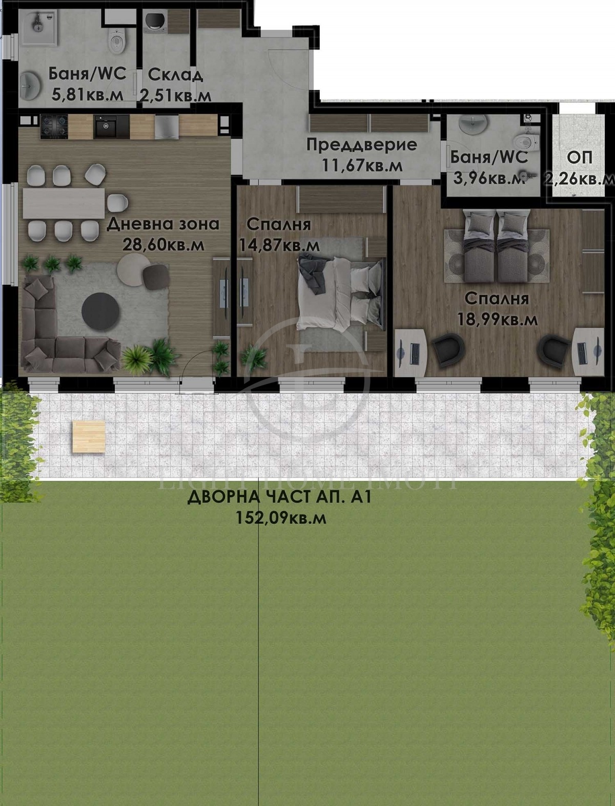 - Разпределение: Просторен и светъл хол с кухненска част и трапезария, две големи спални, две бани с тоалетни, входно антре и собствено дворно място. Към апартамента има прилежащо избено помещение 3,80кв.м