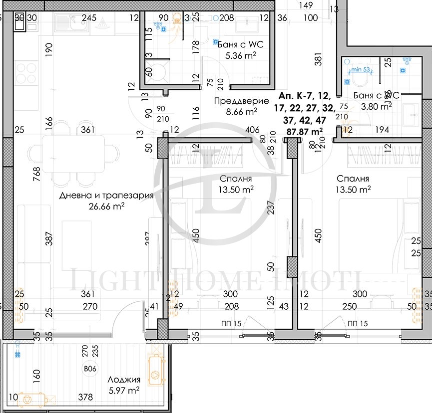 - Разпределение: Просторен хол с кухненски бокс, две спални, две бани с тоалетни, входно антре и тераса. Към апартамента има прилежащо избено помещение 2,69 кв.м.