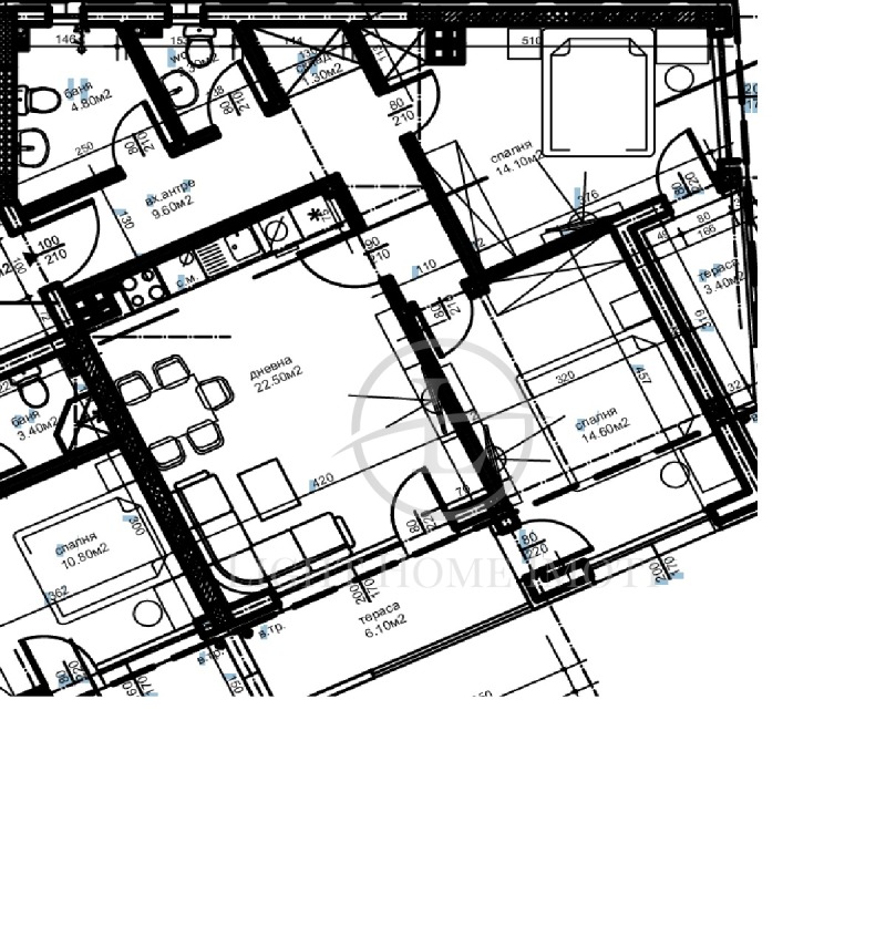 -Разпределение- хол с кухненска част, две спални, баня с тоалетна,тоалетна, входно антре, две тераси и прилежащо избено помещение.
