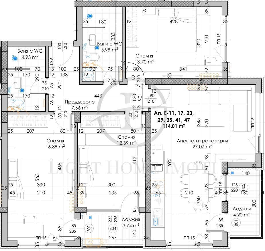 - Разпределение: Просторен хол с кухненски бокс, три спални, две бани с тоалетна, входно антре и две тераси. Към апартамента има прилежащо избено помещение 2,14кв.м
