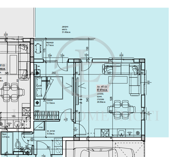 - Разпределение: Просторен и светъл хол с кухненска част, голяма спалня, баня с тоалетна, входно антре, перално-склад ,веранда 7кв.м и дворно място 51кв.м.