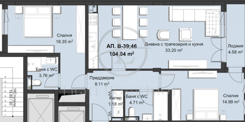 - Разпределение: Просторен и светъл хол с кухненски кът 34кв.м., две големи спални, входно антре, две бани с тоалетни, килер, тераса и прилежащо избено помещение 4,19 кв.м.
