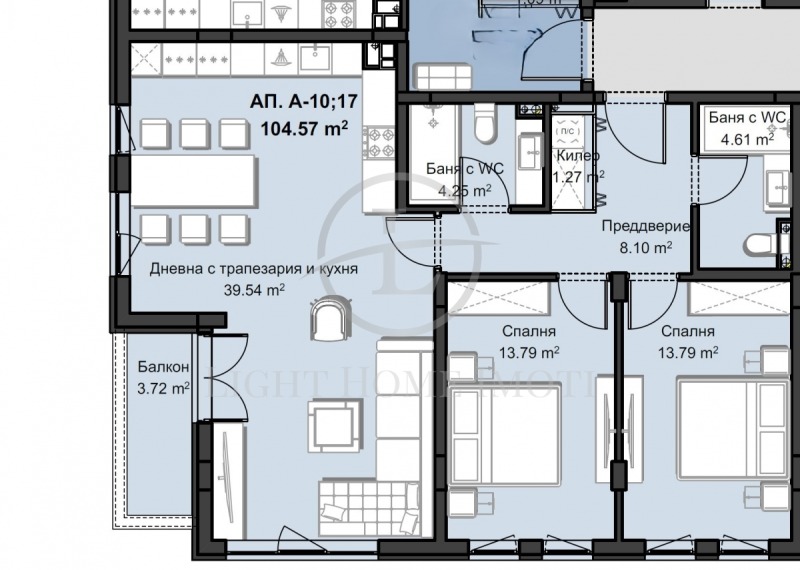 - Разпределение: Просторен и светъл хол с кухненски кът 39кв.м, две големи спални, входно антре, две бани с тоалетни, килер, тераса и прилежащо избено помещение 4,46 кв.м.