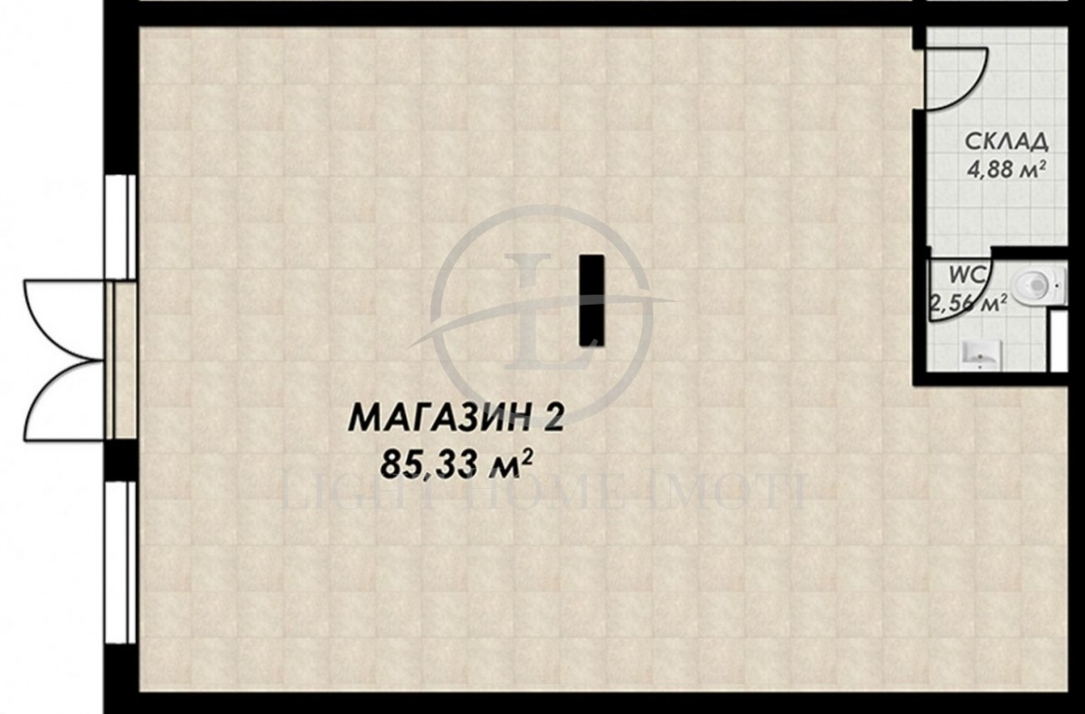 - Разпределение: Голяма търговска зала, предверие, склад и санитарен възел.