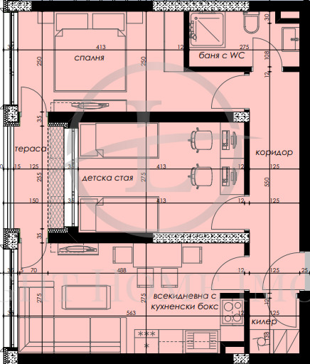 -Разпределение: Хол с кухненски бокс, две спални, баня и тоалетна, коридор, тераса и килер.