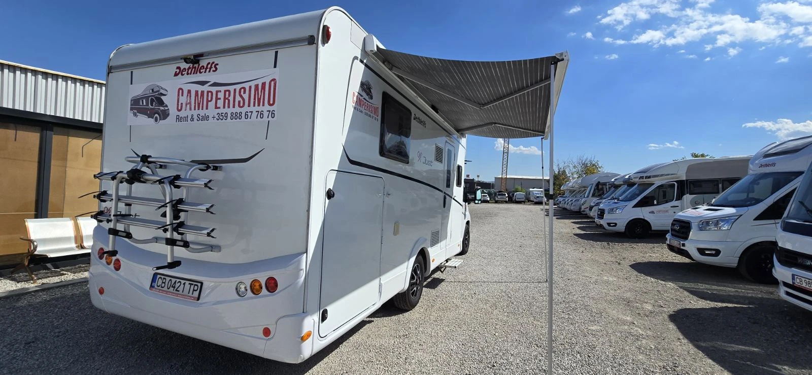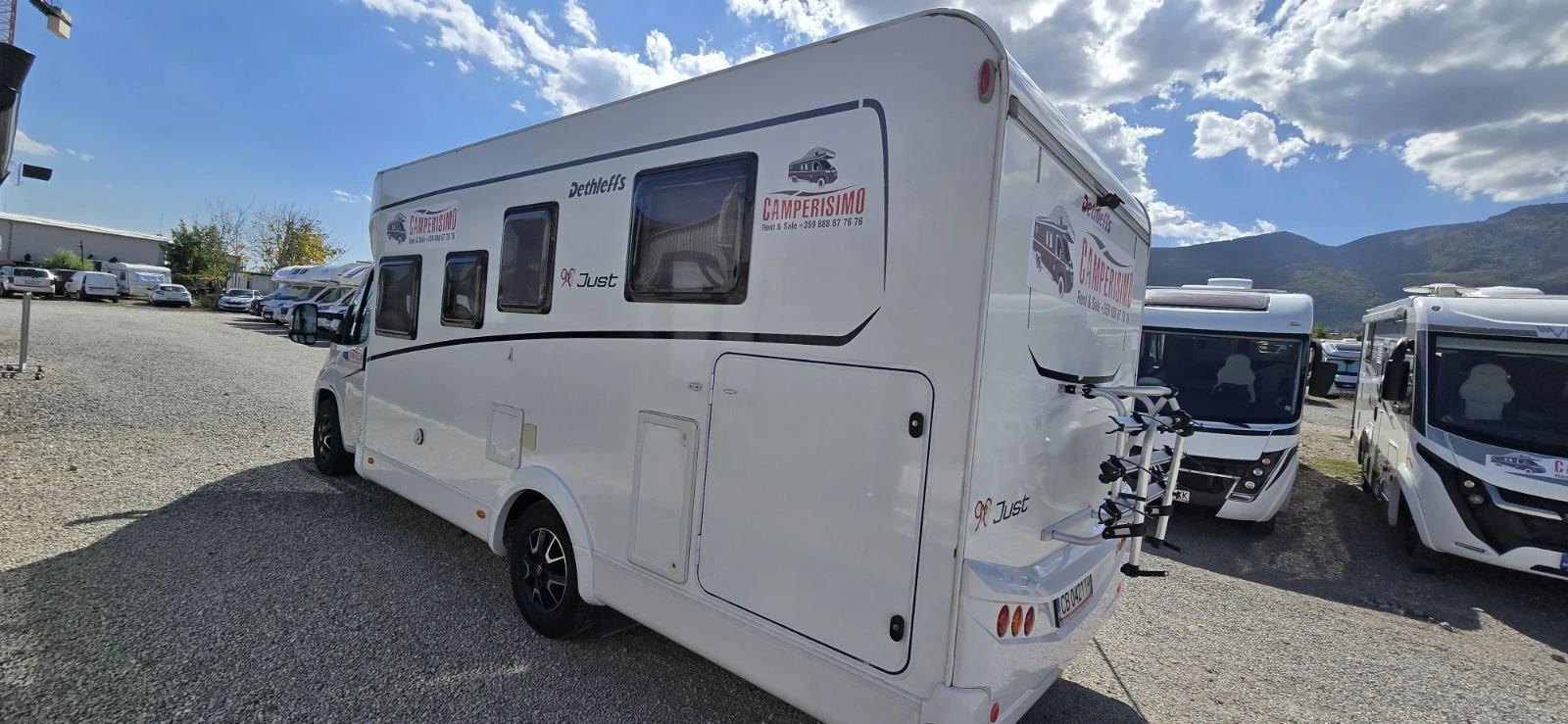 Camperisimo, официален вносител за на марките Dethleffs, Giottiline и Sunlight. Внос на кемпери и каравани. Над двеста кемпера налични за доставка до три дни! Внос на най добри цени на кемпери от марките Hymer, Carthago, Mobilvetta, Roller Team, Challenger, PLA, Notin. Кемпер Dethleffs Just T 7052 DBL на Коледна цена! Шаси Fiat, 2. 2 Multijet 140 к. с. Euro 6d- 3 500 кг Първа регистрация 10/2022г. Пробег 81000км Ръчна скоростна кутия ESP, ASR, Airbag Електрически стъкла Отопляеми странични огледала Start Stop System Алуминиеви джанти 16" Плисе за затъмнение на кабината на водача Дневен сет Face to Face Тапицерия: Chaleur Декор - Дъб Вирджиния Кухня в средата, отделни баня и тоалетна Пакет шаси на Fiat (LED дневни светлини, електрически регулируеми и отопляеми външни огледала, автоматичен климатик, круиз контрол, въздушна възглавница за пътници, подготовка за радиосистема със звуков пакет, кожен волан и топка на скоростната кутия с кожен ръкав, арматурно табло с хромирани пръстени) Семеен пакет (входна врата с комарник, осветление за тента 12 V, панорамен люк на покрива 70x50 см в дневната, затъмняващи щори в кабината на водача, амбиентно осветление, пакет с LED светлина, врата на тялото с прозорец и централно заключване , регулиране на височината и наклона за седалка на водача и пътника отпред. Дизайнерски пакет (дървен декор от дъб Вирджиния, бяла ламинатна маса и кухня, входна зона със задно осветяване (магнолия с висок гланц), хромирана дръжка във входното пространство, гардероб с покритие от плат, включително хромирани куки за палта (в зависимост, контакти и ключове в двуцветен, ) Кралска спалня Електрическо падащо легло 206x135cm Резервоар за чиста вода 120L Резервоар за сива вода 100L Соларна система Камера за заден ход Подготовка за система SAT Климатик за жилищна част Инвертор Тента Газова фурна Багажник за велосипеди