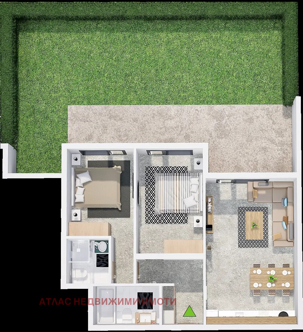 Към апартамента принадлежи и собствен двор с площ 72.08 кв.м., достъпен директно от дневната и спалните. Това осигурява повече пространство и удобство, както и възможност за зелена градина или кът за релакс.