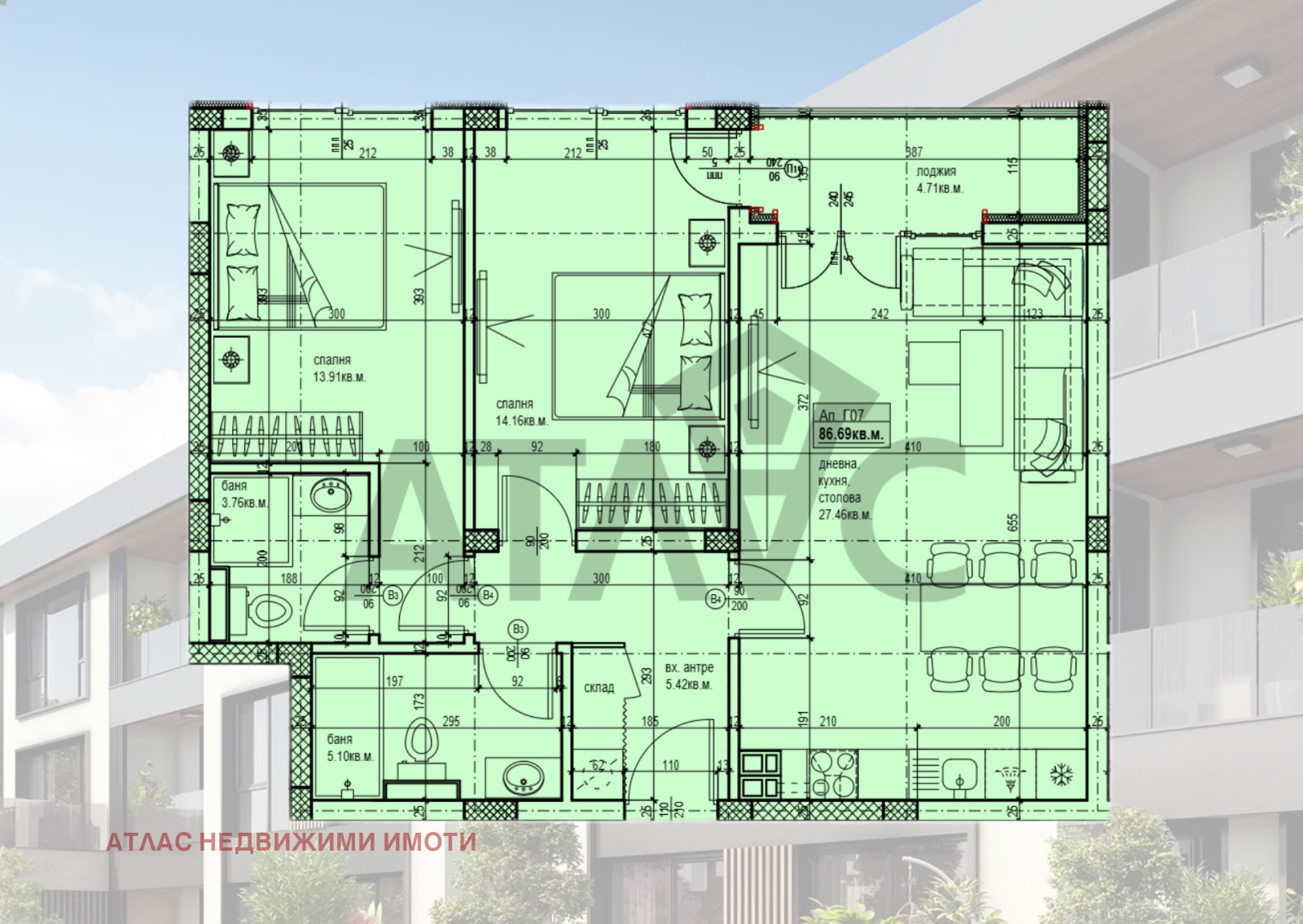 Тристаен апартамент! Жилището е с площ 100,73 кв.м. и е с отлично разпределение: просторна дневна с кухня и трапезария, две самостоятелни спални, две бани с тоалетни, входно антре, склад и тераса.