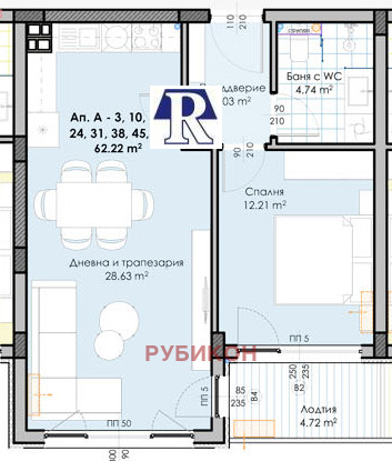 Разпределението на апартамента е както следва: просторна дневна с кухненски бокс 28.63кв.м., спалня(12.21кв.м.), баня с тоалетна 4.74кв.м., преддверие 4.03кв.м. и лоджия(4.72кв.м.). Изба 3.32кв.м. Застроена площ 62.22 кв.м. Общи части - 9,64 кв.м. Общо площ - 75.18кв.м. Изложение - Юг! Към жилището имате възможност да закупите и паркомясто или гараж, които се заплащат допълнително.