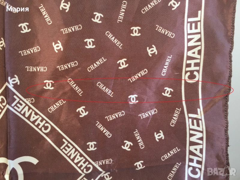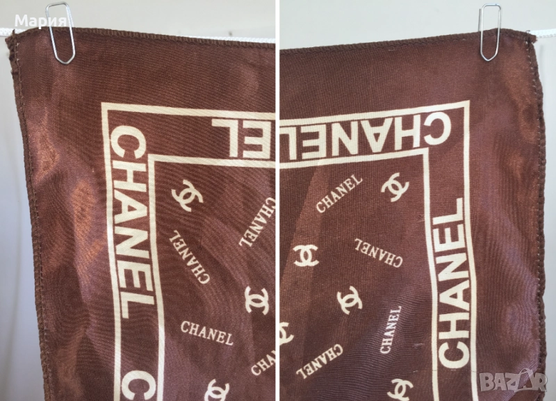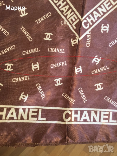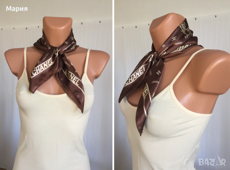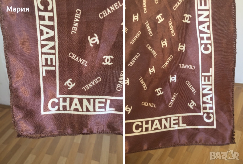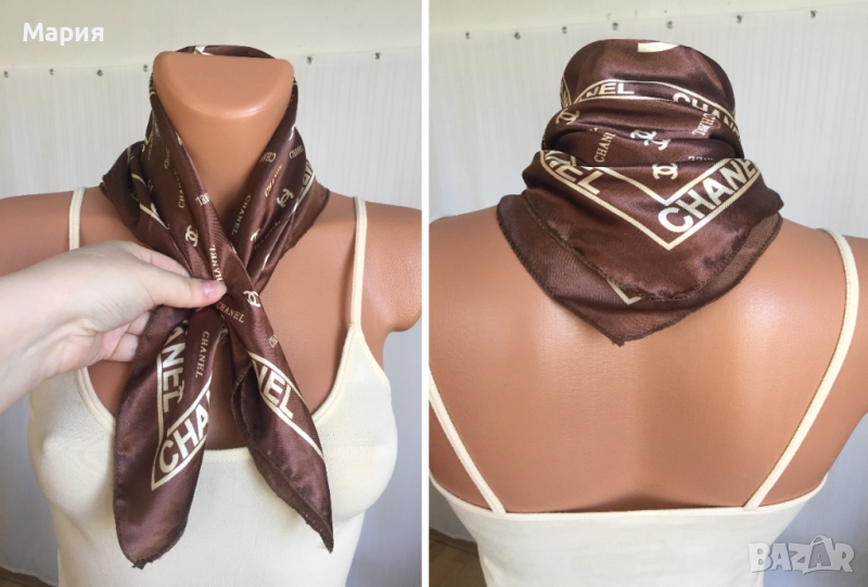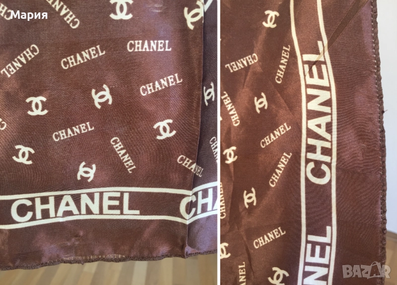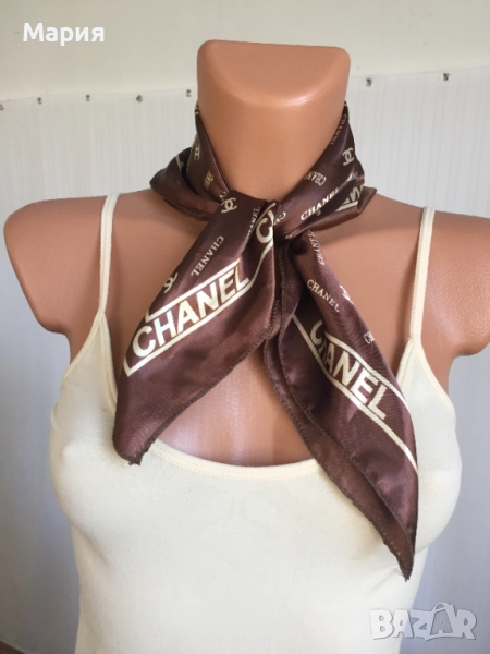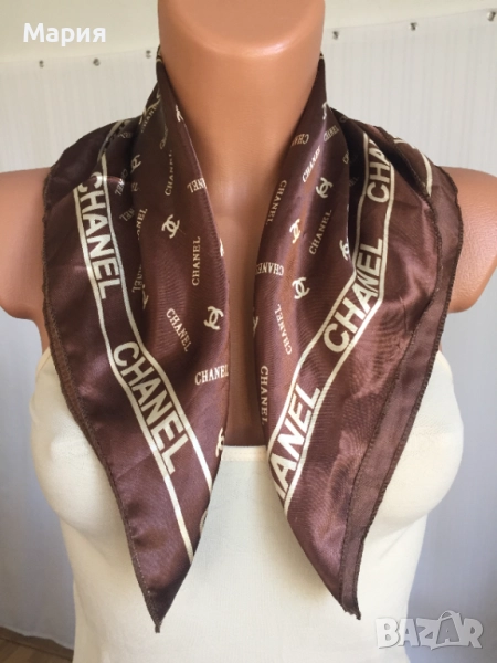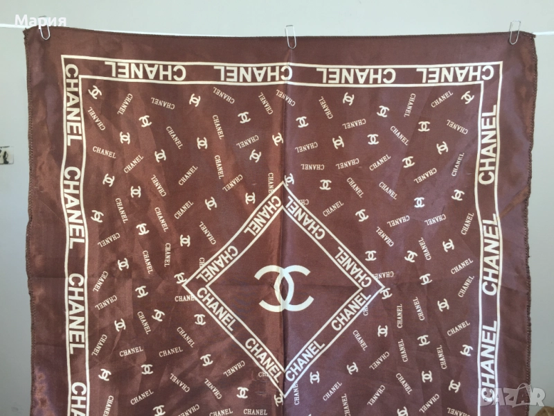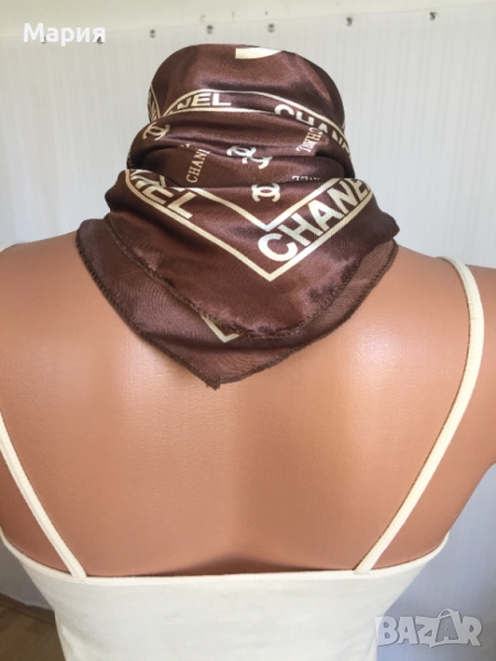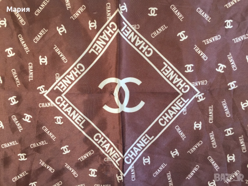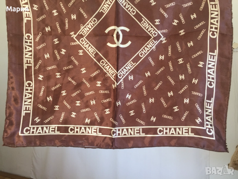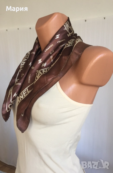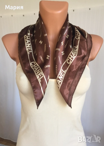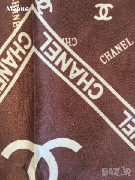 Дамски Квадратен Шал Кафяв Бежов / Кремав Полиестер Сатен Chanel Шанел Лого → Обява 51822664