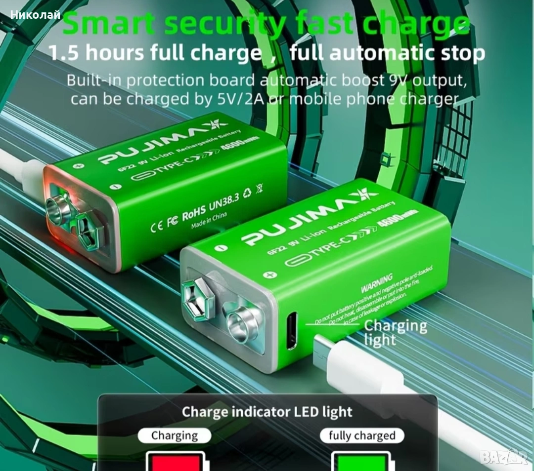 9V PUJIMAX Li-ion battery (полимерни литиево-йонни батерии), 4600mAh, акумулаторни/презареждащи с висок капацитет. Метод на зареждане: кабел с конектор USB Type C Зареждат се директно с кабел. При зареждане на батерията свети червен диод, при заредена батерия светва в зелено. Диодите са вградени в самата батерия.