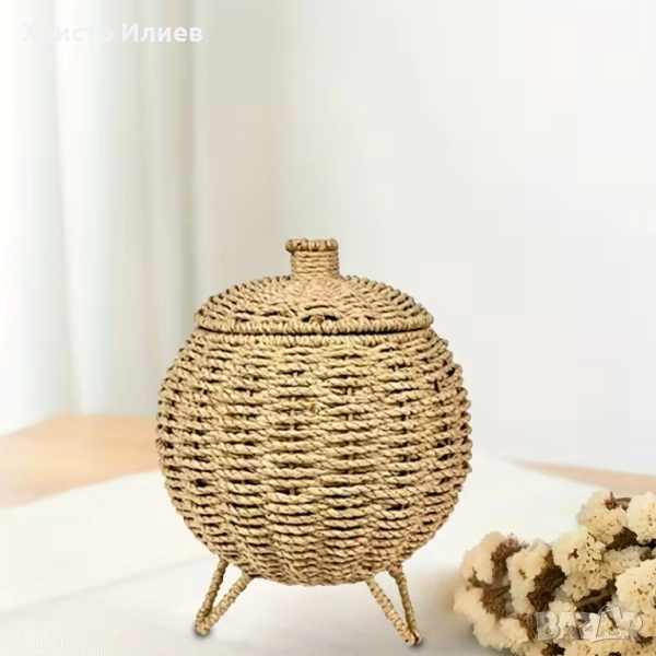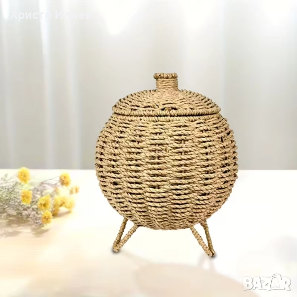 Голяма ратанова кошница с капак Огранайзер за кафе капсули Бохо стил Рустик