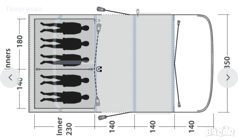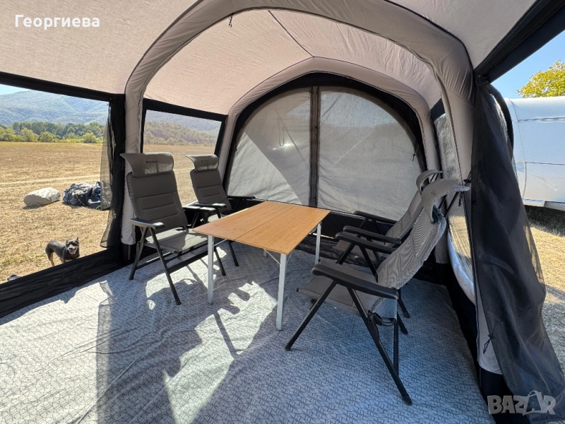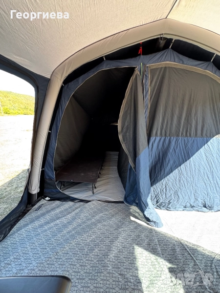 Благодарение на надуваемата конструкция и цветно кодираните обръчи, ремъци и колчета палатката се поставя бързо и лесно. В опаковката има надуваема помпа и транспортен калъф с компресионни ремъци, който улеснява пренасянето на палатката. Ако искате да разширите пространството в коридора, препоръчваме да добавите универсален удължител или универсална тента.