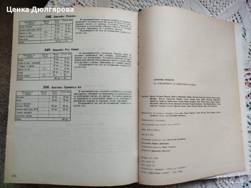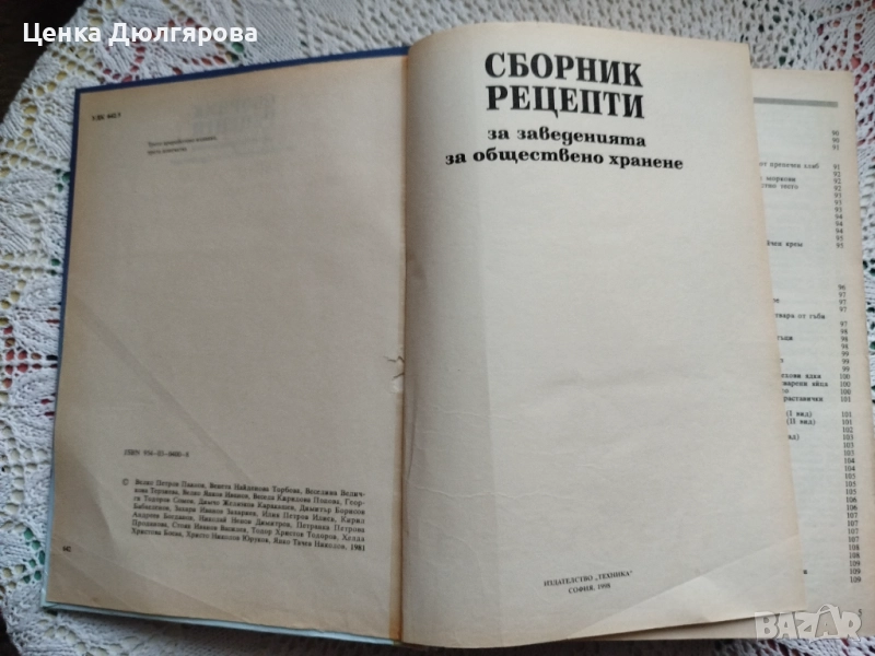Сборник рецепти за заведенията за обществено хранене" на издателство "Техника", издание 1998 г. в голям формат с твърди корици в 974 страници, добро състояние видно от снимките, има забележки само по корицата.