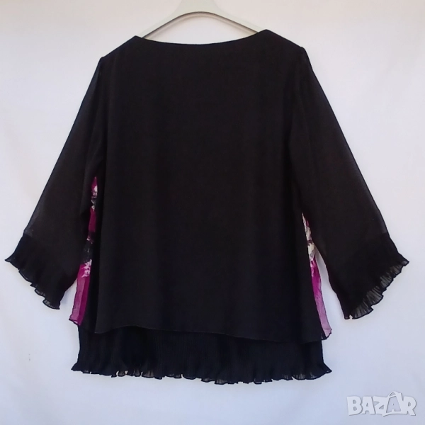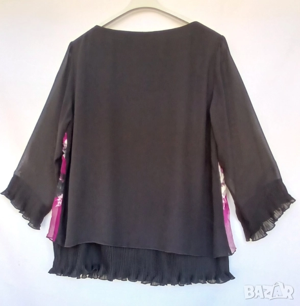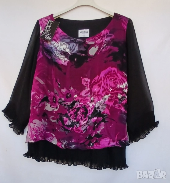 Дамска луксозна копринена блуза с прозрачни черни ръкави. Красива стилна и подходяща за всякакви поводи и за официална. Нова. Марка АLISON, номер 44, който отговаря на XL. Обиколка на гърдите 112 см, дължина на блузата 68 см. Блузата не е еластична. Цена 28 лв.