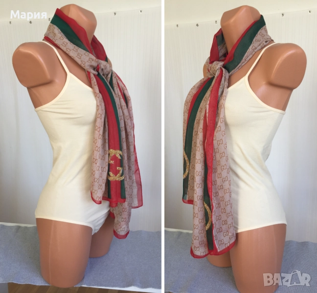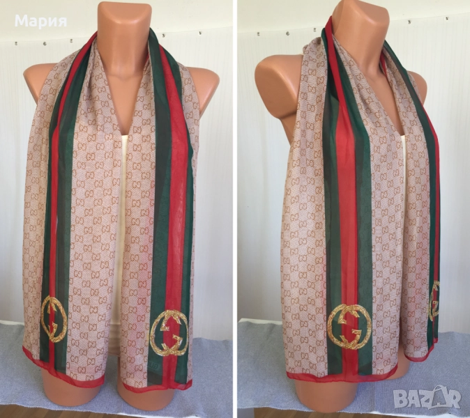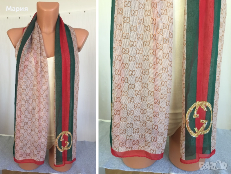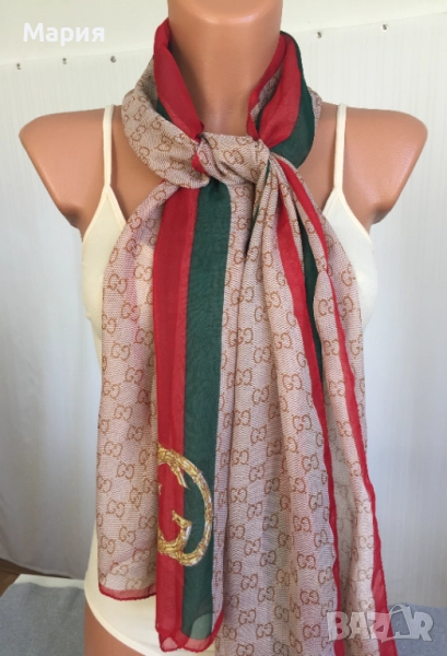 Нов Дамски Шал Gucci Прозрачен Лого Гучи Бежов Червен Зелен → Обява 51826454