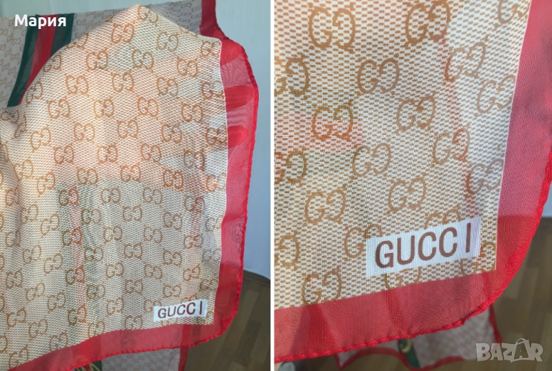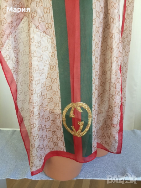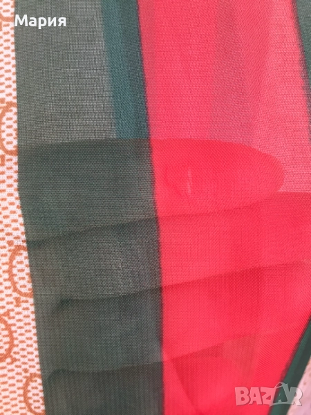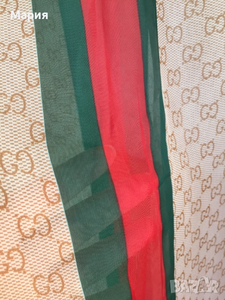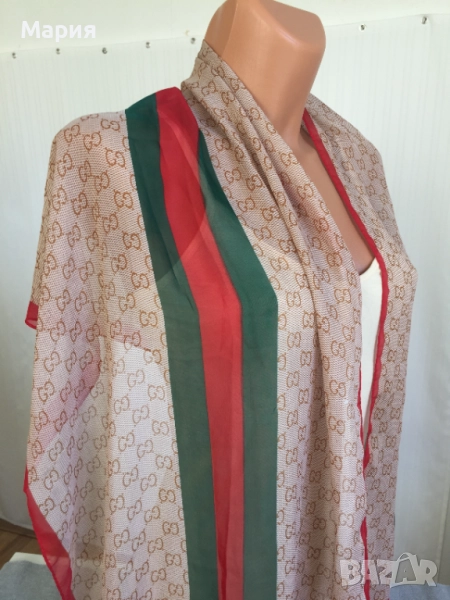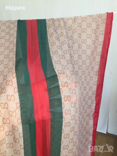 Продавам дамски прозрачен шал с надпис Gucci и емблематичните цветове и лого.