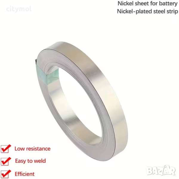 Тази никелирана плоска лента с размери 0,1 mm x 10 mm и дължина 10 метра е идеална за точково заваряване на 18650, 21700, 26650, 32650 и др. батерии и клетки.