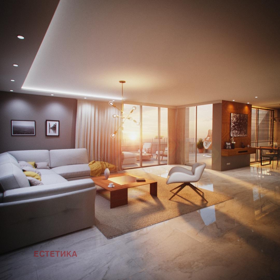Апартаментът е със следното разпределение : Дневна с трапезария, кухненски бокс, който може да се отдели като самостоятелна кухня, кът за сядане отворена към голяма южна тераса, 3 спални по 17, 13 и 12 кв.м. , 2 бани и още 2 тераси към две от спалните.