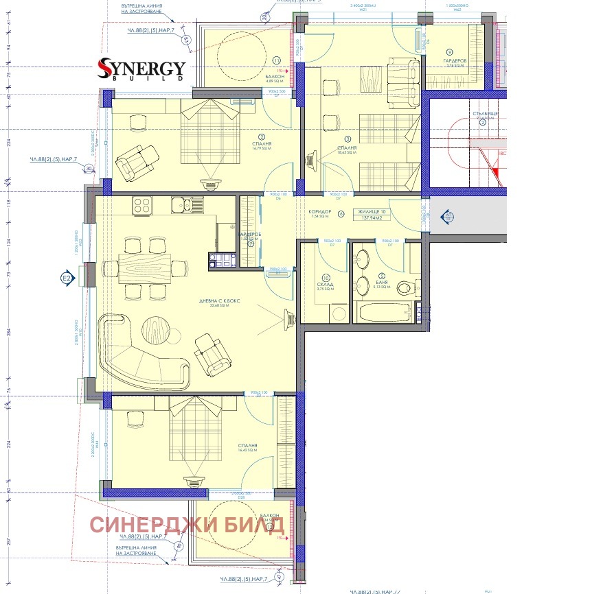 С тази обявя Ви представяме Апартамент 6 с площ 157 кв.м., на втори жилищен етаж, състоящ се от коридор, хол с кухненски бокс, три спални, склад, две бани с тоалетни, баня с тоалетна и две тераса.