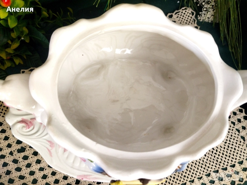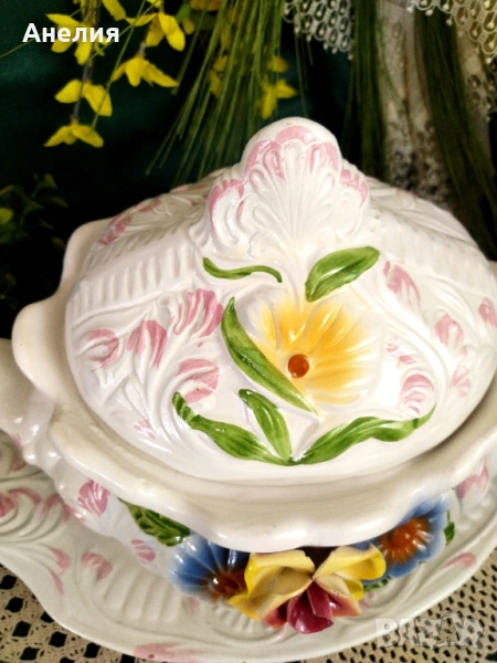 🌼Бял порцеланов или керамичен съд с капак и дръжки, украсен с релефни цветя и листа в пастелни цветове, както и розов орнамент по ръбовете.