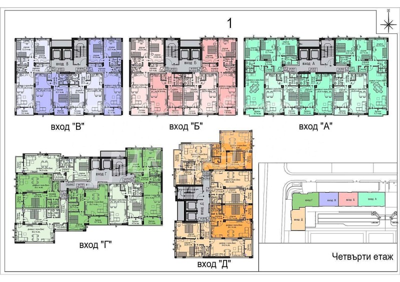 Сграда 1 е проектирана с пет самостоятелни входа. Визията ѝ съчетава модерна фасадна композиция с топли цветови акценти, които придават динамика и елегантност на силуета. Подземното ниво е изцяло отделено за гаражи и паркоместа, а в дворното пространство са обособени външни зони за паркиране и зелени площи.