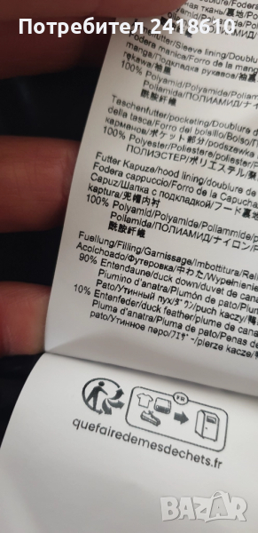 Пълнеж от пух и пера 90 % - 10%Качулката е на цип и може да се сваля.