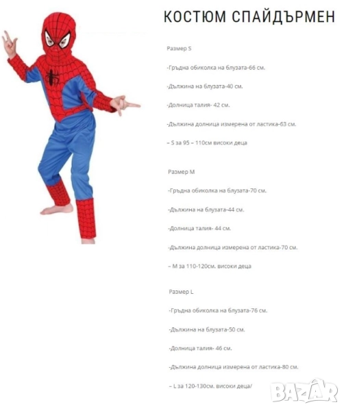 Костюма на Spiderman се състои от 3 части: блуза, панталон и маска.